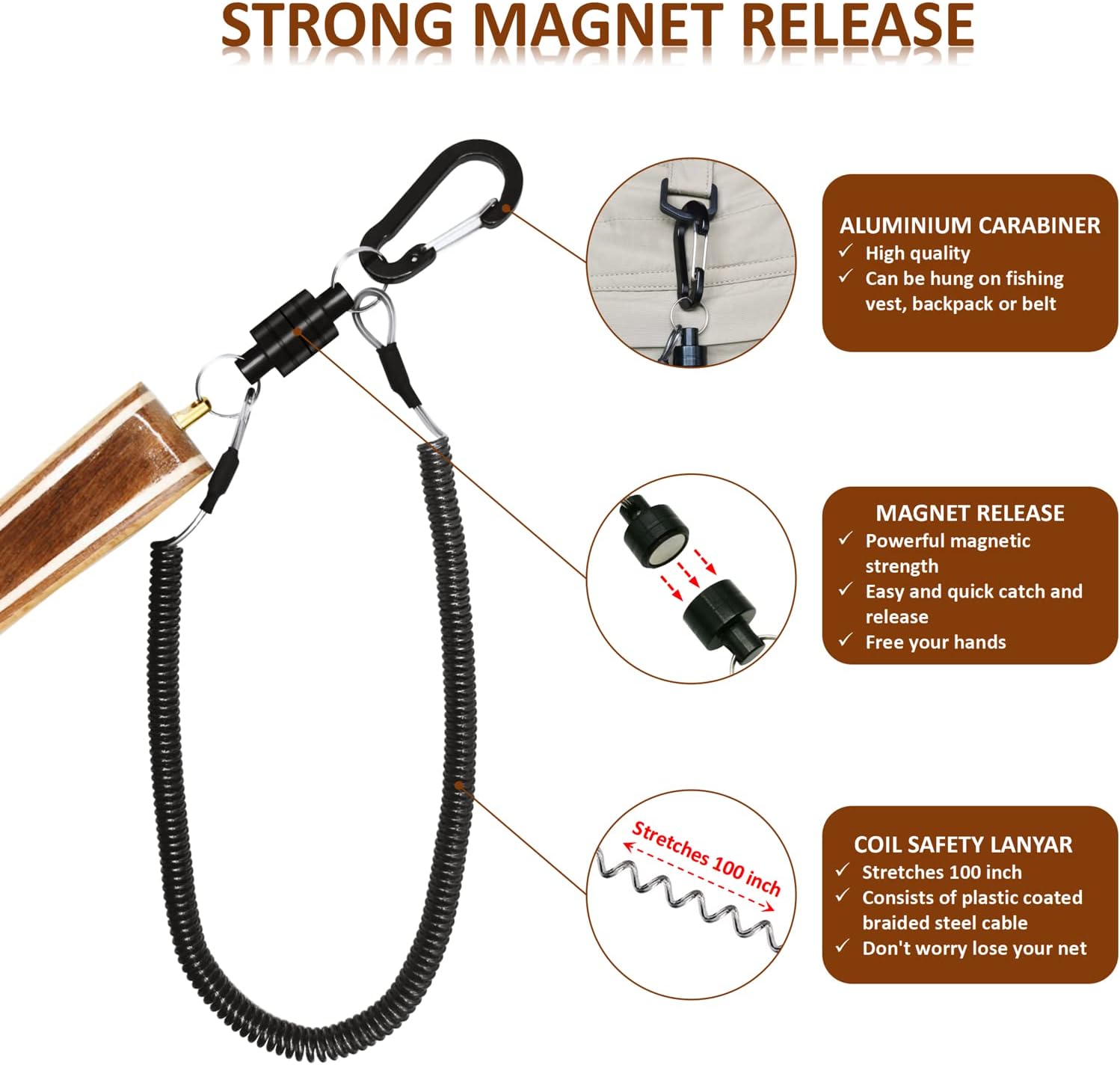 – **Magnetic Release**: For quick and easy access, the net includes a magnetic release system. This feature allows you to secure the net to your vest or belt and release it with one swift motion when needed, ensuring you’re always ready to land your catch.